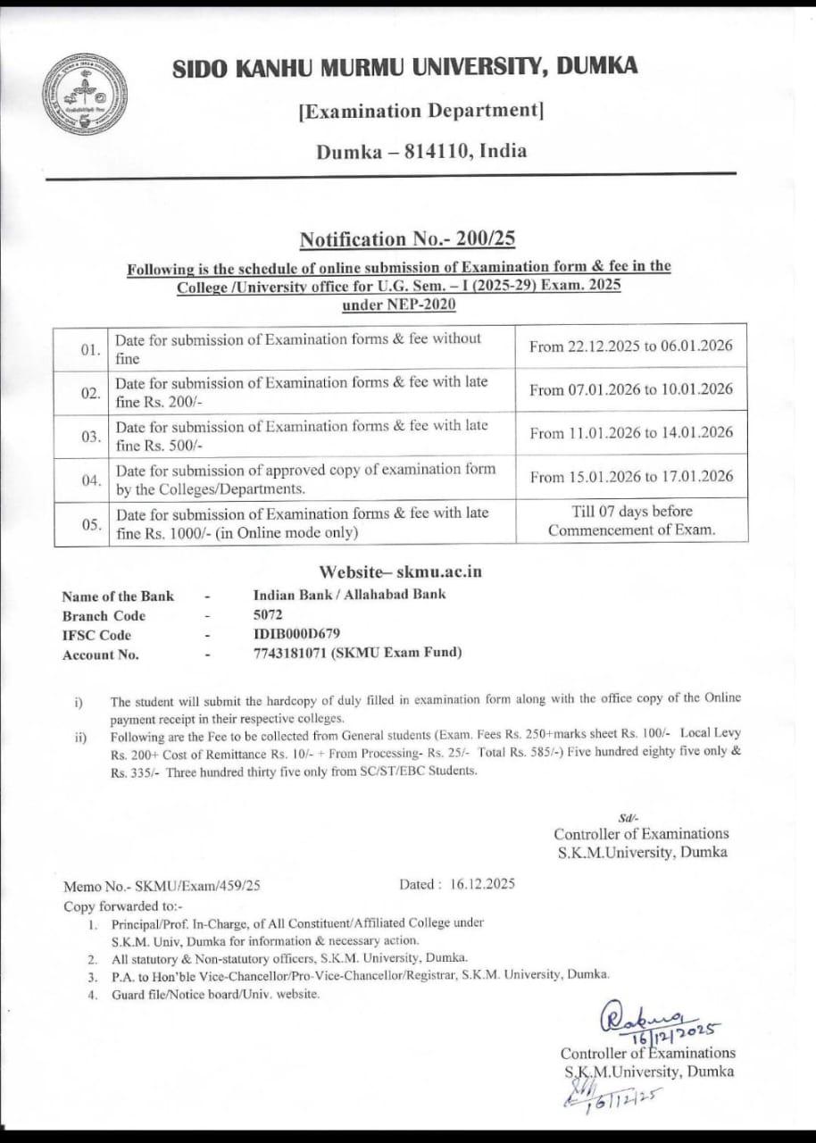 SKMU UG SEM 1&2 OLD COURSE CBCS EXAM FORM FILLUP DATE