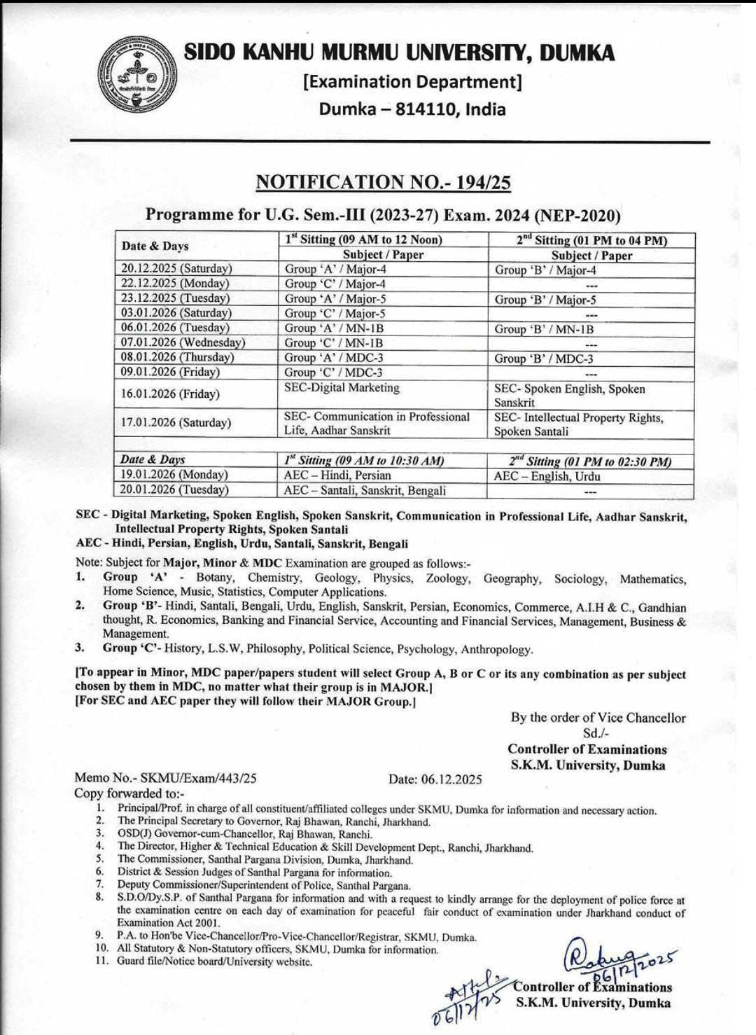 SKMU UG SEMESTER 3 NEP 2023-27,2022-26